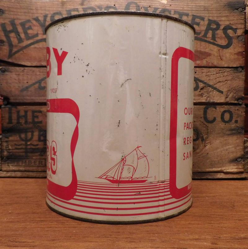 This is the "distributors" version of the Helsby can, and was actually packed in VA by Capt. Fisher in Sanford. The can is in pretty nice condition, has a few marks and a couple small wrinkles but paint is nice and bright.